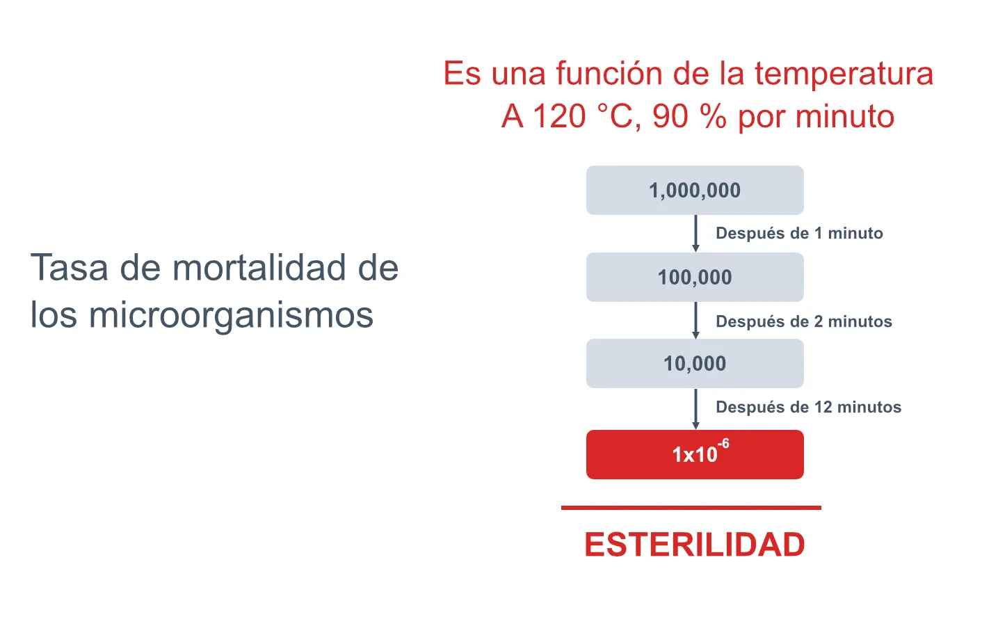 La eliminación microbiana por calor no es instantánea — sigue un patrón logarítmico predecible. A 120 °C, aproximadamente el 90 % de los microorganismos muere por minuto. Esto significa que el tiempo de exposición reduce la población superviviente en un orden de magnitud (un log₁₀) cada minuto. Partiendo de un instrumento con 1.000.000 (10⁶) organismos: