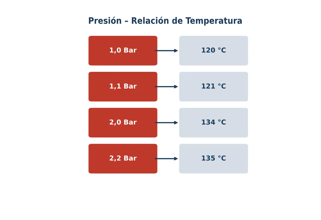 En un entorno de vapor saturado, presión y temperatura están directamente vinculadas: 1,1 bar corresponde a 121 °C y 2,0 bar corresponde a 134 °C. Esta relación es fija — cualquier desviación indica contaminación por aire.