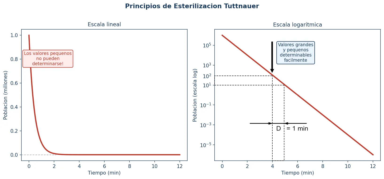 El gráfico izquierdo (escala lineal) muestra el descenso de la población que parece alcanzar cero — pero los valores pequeños se vuelven invisibles. El gráfico derecho (escala logarítmica) revela el perfil de eliminación real y permite medir y validar con precisión el punto de SAL 10⁻⁶. Este es el fundamento científico para usar indicadores biológicos (tiras de esporas con poblaciones iniciales conocidas) para validar cada ciclo del autoclave.