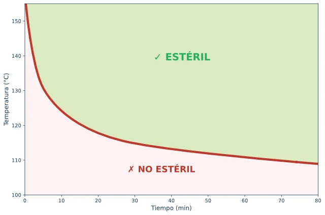 Las temperaturas más altas permiten tiempos de exposición más cortos porque la letalidad del calor húmedo aumenta drásticamente con la temperatura. Un ciclo de 3 minutos a 134 °C produce una eliminación microbiana equivalente a un ciclo de 15 minutos a 121 °C. Esta compensación entre temperatura y tiempo puede visualizarse como un límite de letalidad: cualquier combinación de temperatura y tiempo que se sitúe por encima de la curva logra la esterilidad; todo lo que esté por debajo no lo hace.
