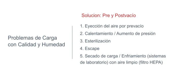 - Eyección de aire por prevacío — la bomba de vacío elimina activamente el aire de la cámara y la carga antes de introducir cualquier vapor